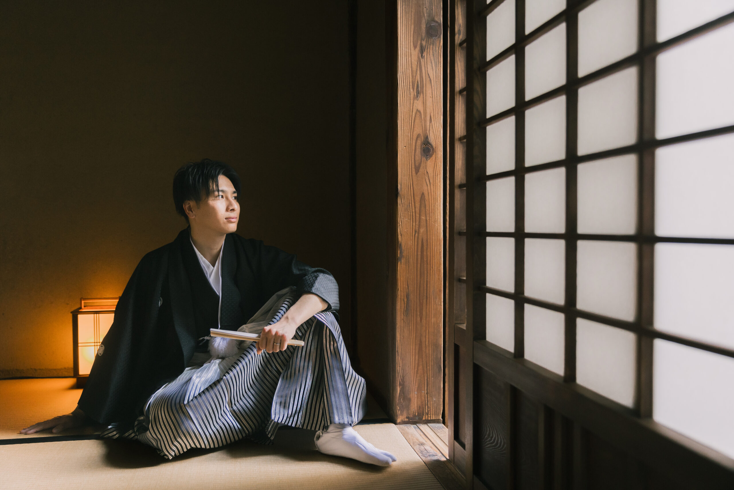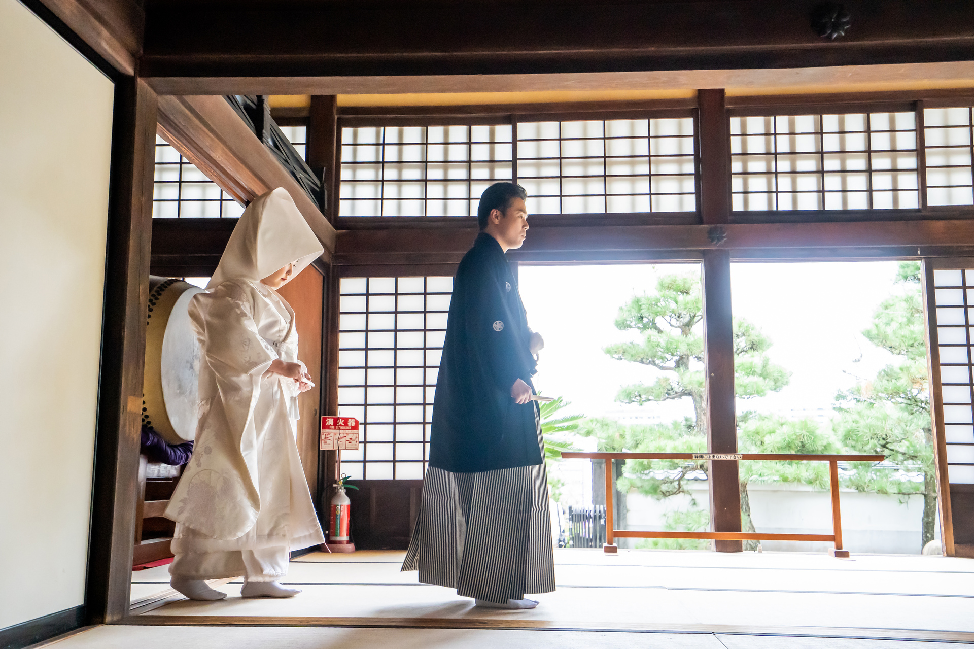 The groom's dignity: The groom, dressed in a crested hakama, looks extremely dignified, and when paired with the bride in traditional Japanese attire, they create a beautiful and unified image of the couple.