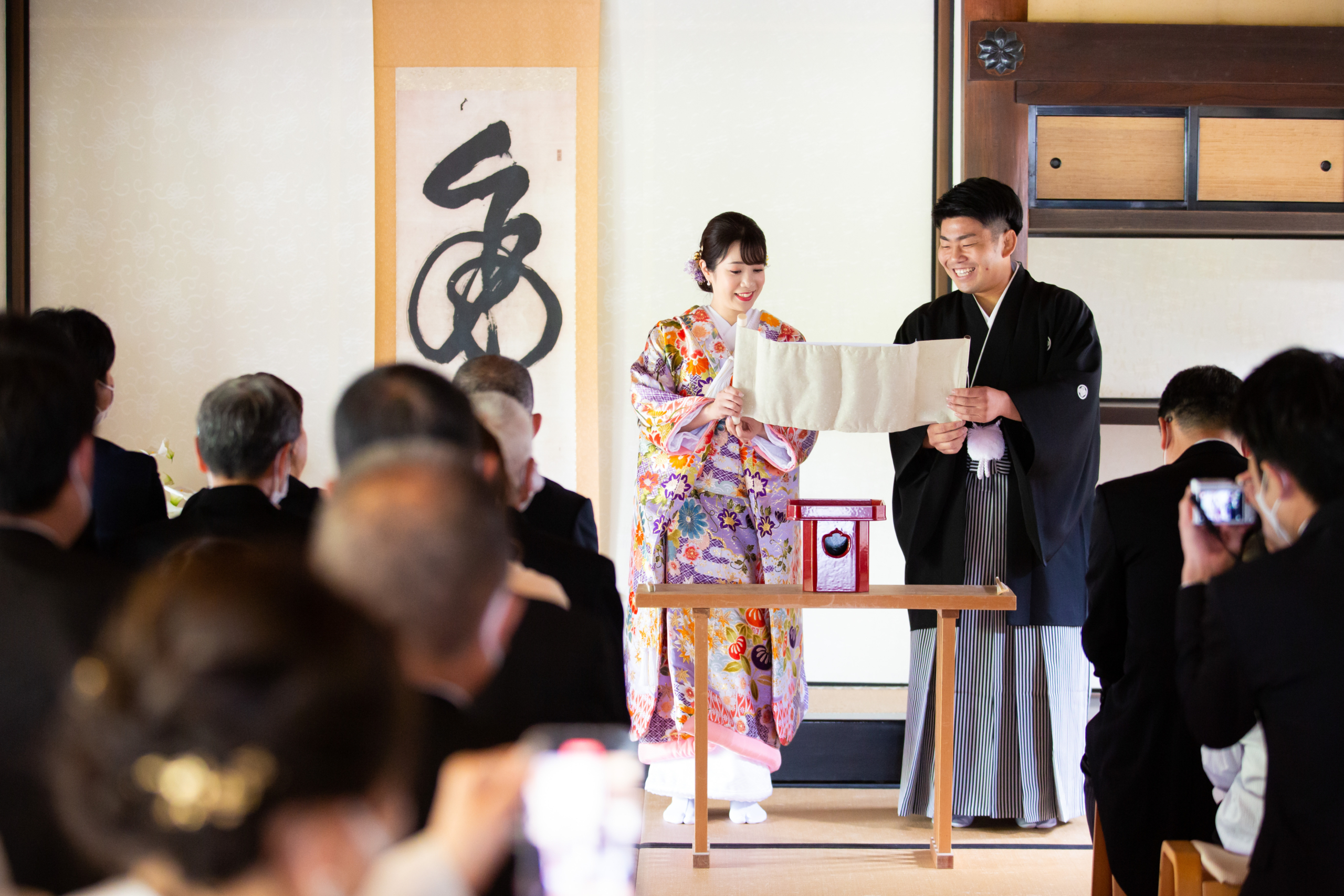 挙式は歴史的な建物や風景に囲まれた場所で行われ、伝統的な和装を身にまとった新郎新婦様が、誓いを交わす幻想的な瞬間を迎えます。