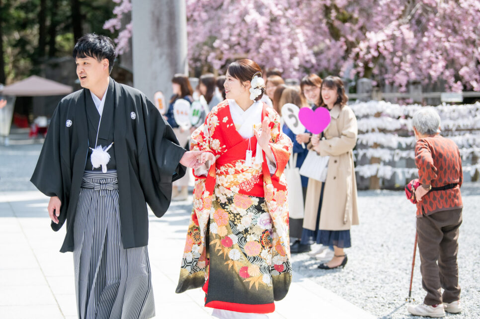 春の小国神社での和婚は、まるで絵巻物のような美しい情景がお二人を祝福します。